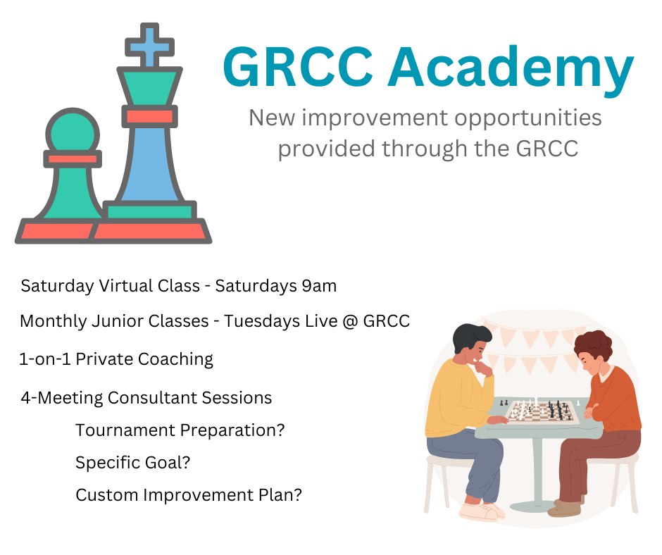 There are lots of resources in the chess world. There is also lots of advice. We take the best of our experience and combine them with a personalized plan to help you succeed. Through membership at the GRCC and with our Learning Academy we can help you succeed with a relevant understanding of you and your experiences in chess. We combine that with a stable community around you to make for a rewarding effective learning experience.