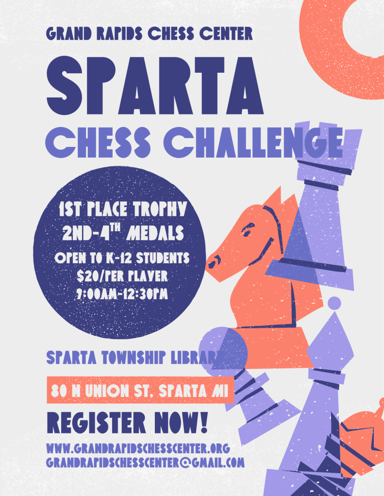 Join the Grand Rapids Chess Center at a fun scholastic chess tournament hosted in Sparta, Michigan. This event will be a great way for your students to gain tournament experience in a fun and easy-to-play atmosphere. Check out the details!
